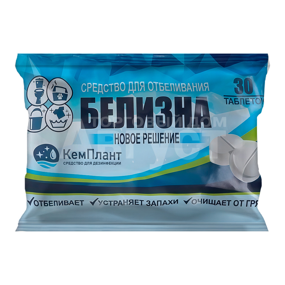Белизна в таблетках- содержит натриевую соль дихлоризоциануровой кислоты (62%), функциональные и моющие добавки. Содержанит активный хлор 32–35%. Применяется в быту для отбеливания, стирки и обеззараживания белья, мойки посуды, полов, элементов уборной комнаты и т. д.