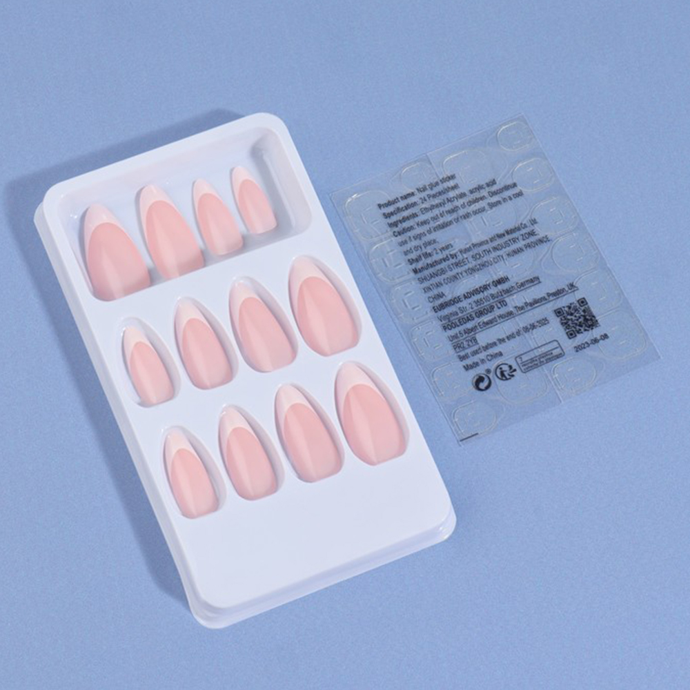 Эти миндалевидные накладные ногти — готовое решение для утончённого образа. Нежно-розовая основа с белыми кончиками выглядит естественно и подчёркивает изящество формы. В комплекте 24 штуки и клеевые пластины, которые обеспечивают надёжную фиксацию без использования жидкого клея.